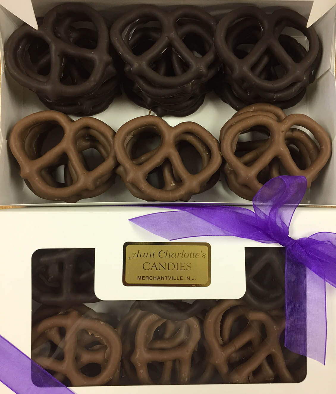 Delicious pretzels covered in milk, dark or white chocolate. Available in a single chocolate covering or a mixed assortment.
