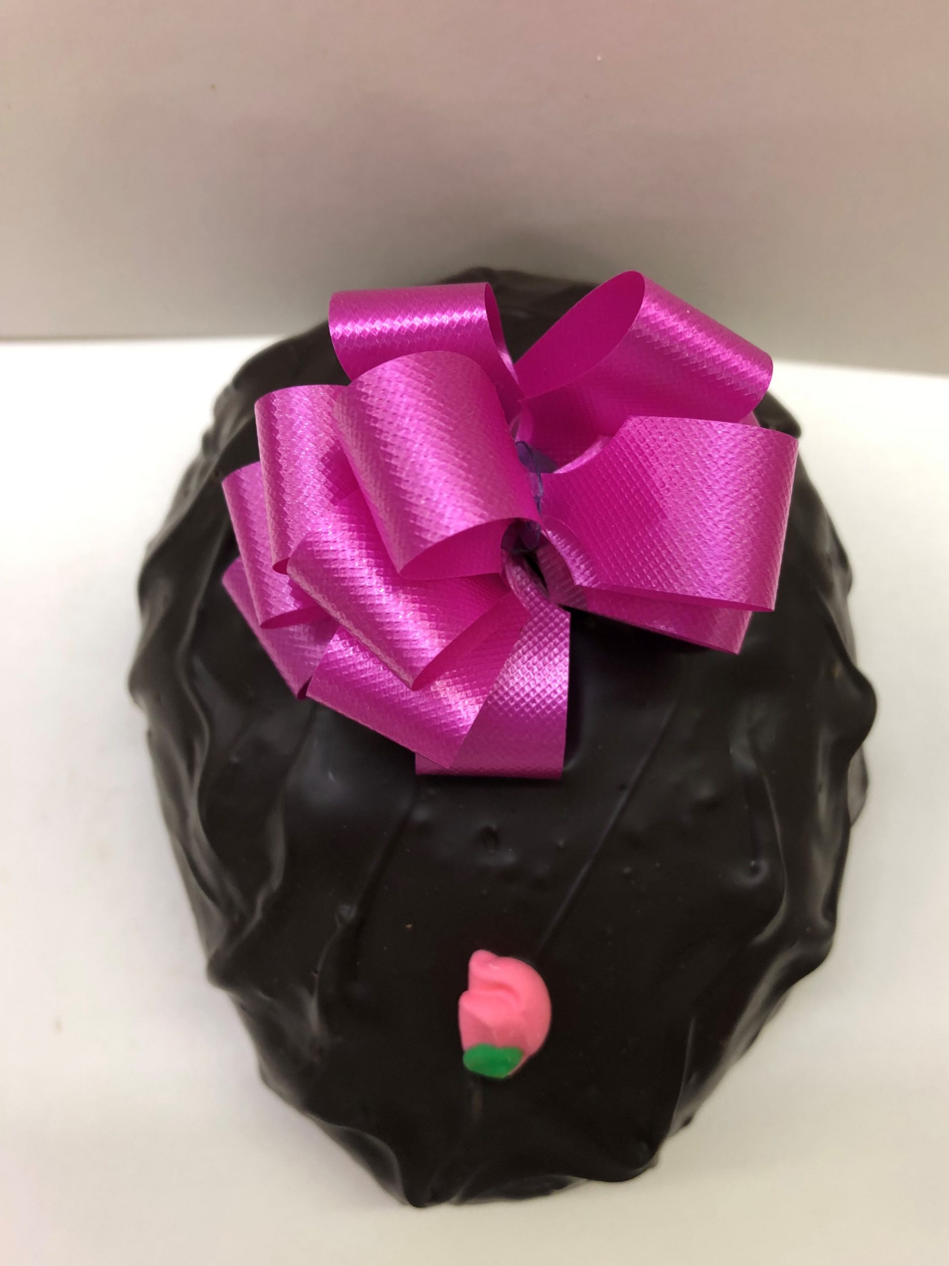 1 lb coconut cream egg coated in chocolate and decorated with a bow and icing flower