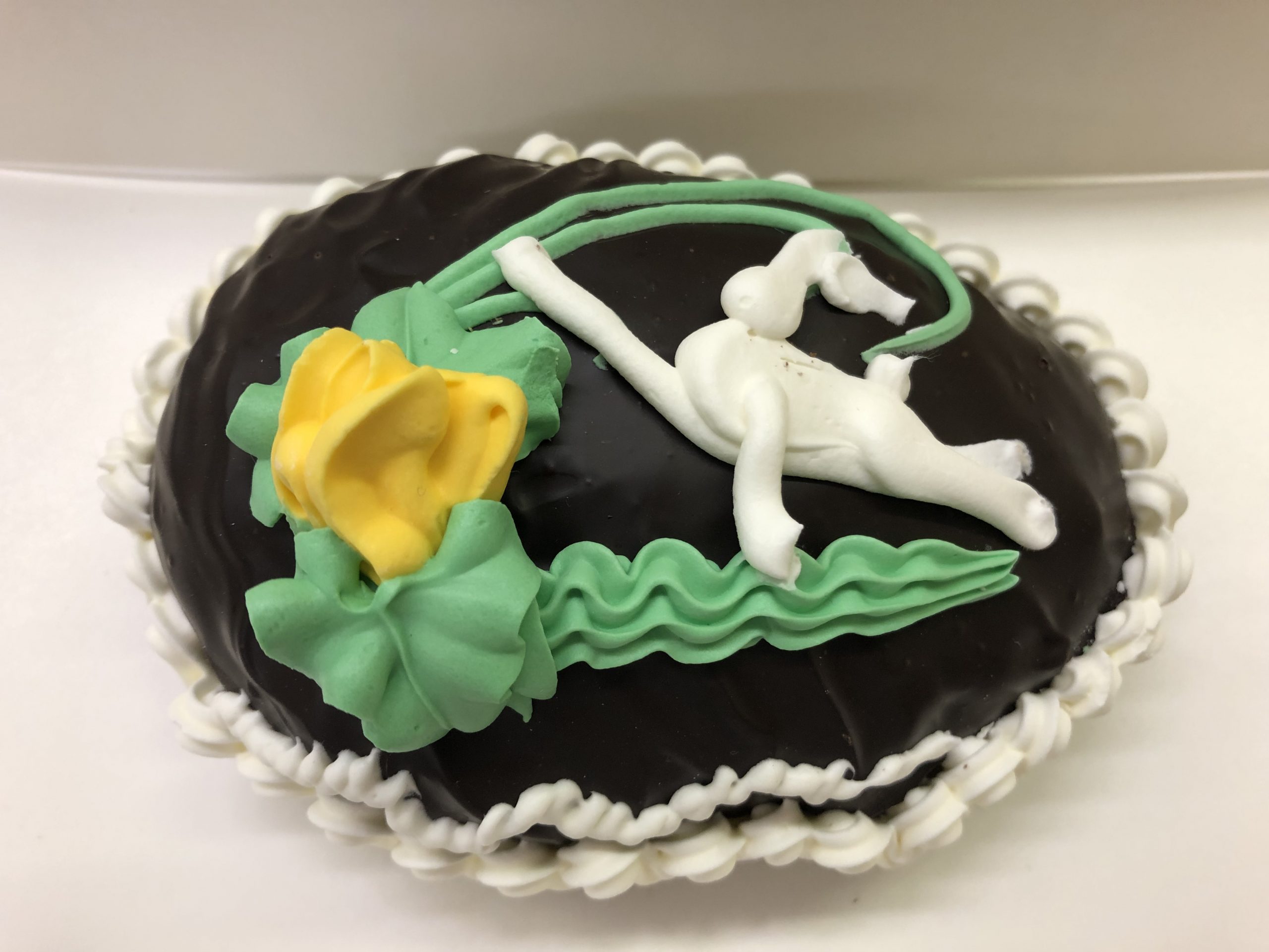 1 Lb Coconut Cream Egg coated in dark chocolate. Decorated with royal icing.