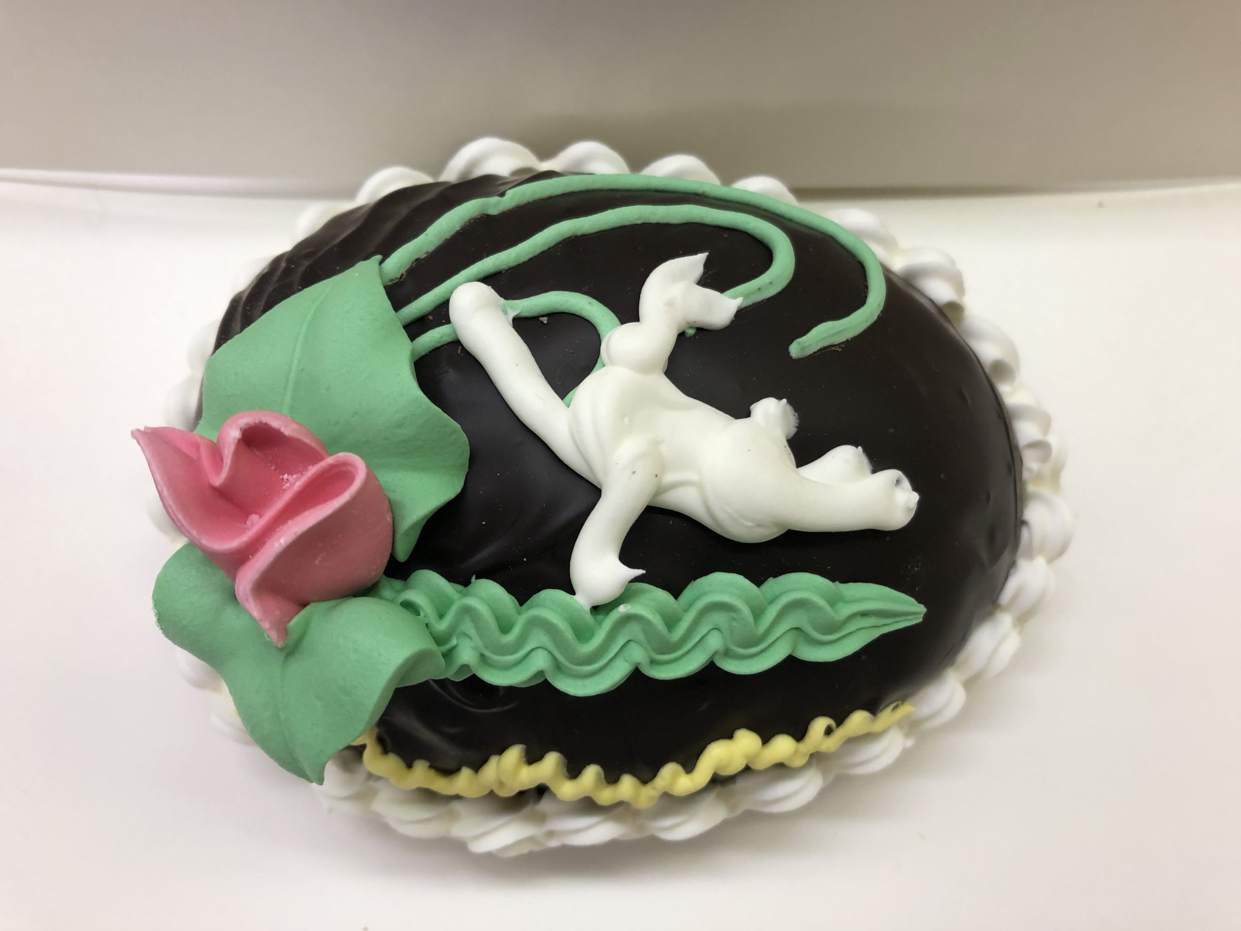 1 lb butter cream egg coated in dark chocolate. Decorated with royal icing.