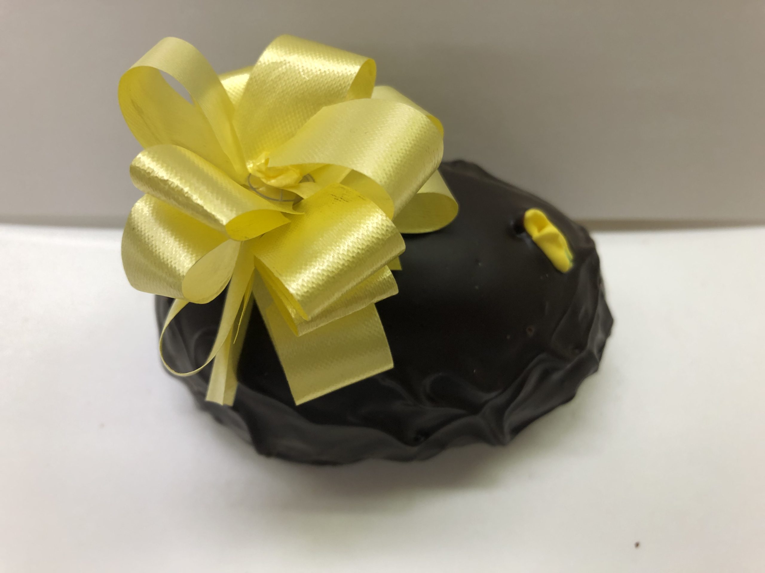1/2 lb butter cream egg coated in chocolate. Decorated with a bow and icing flower.