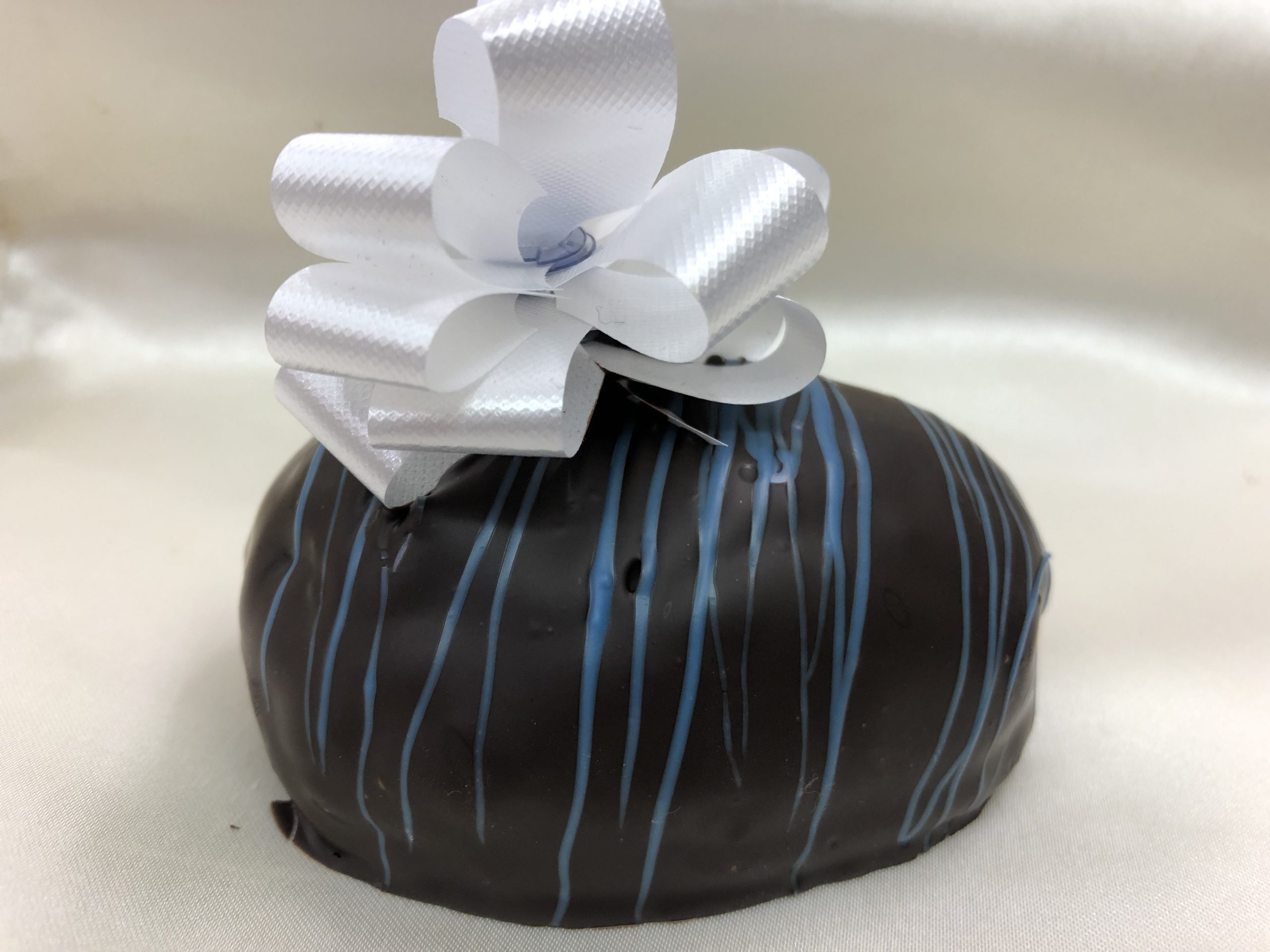 1/2 lb fruit and nut egg consists of a vanilla cream mixed with cherries, raisins, pineapple, and walnuts. Coated in chocolate and decorated with a bow.