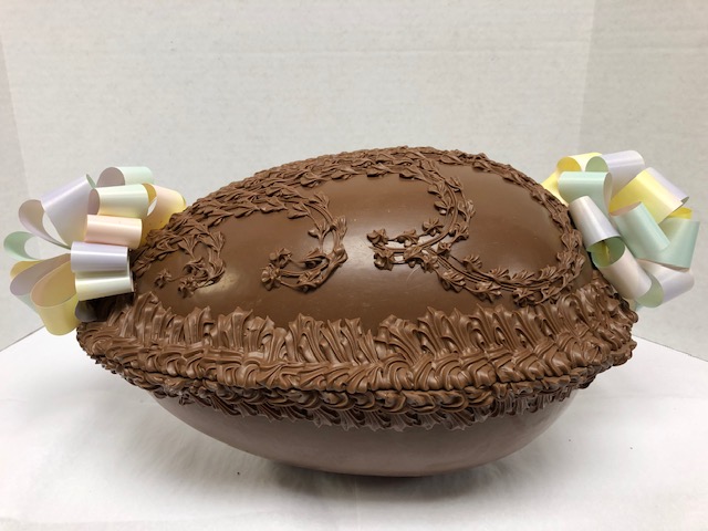 Milk Chocolate 15 inch Shell Egg decorated with a chocolate border and chocolate on the top.